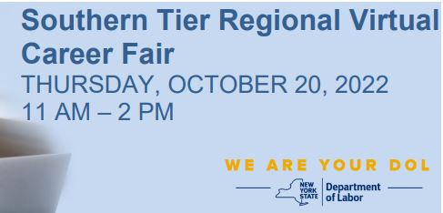 Register today for the New York State Department of Labor's free Southern Tier Virtual job fair happening on October 20th, from 11:00am to 2:00pm!