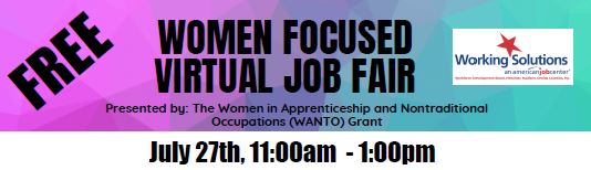 Our Workforce Development Board's Women in Apprenticeship and Nontraditional Occupations (WANTO) grant program FREE virtual job fair will take place on Wednesday, July 27, from 11:00am to 1:00pm.