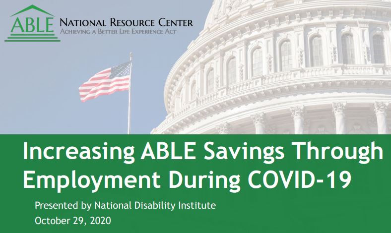 From the ABLE National Resource Center: "This webinar will review the basic rules for funding an ABLE account from contributions and earned income. Information about ease of access to savings and investments to address COVID-19 expenses will be shared, as well as best practices on integrating ABLE accounts into employment services for customers with disabilities. The webinar will also include how ABLE savings helps people with disabilities to begin and maintain employment and engage in career development to maximize their earnings, use of work supports and savings potential, including savings for retirement."