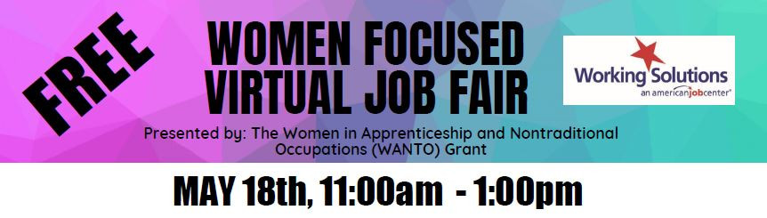The Workforce Development Board's Women in Apprenticeships and Nontraditional Occupations (WANTO) Grant Program is holding a virtual career fair on Wednesday, May 18th, from 11:00am to 1:00pm!
