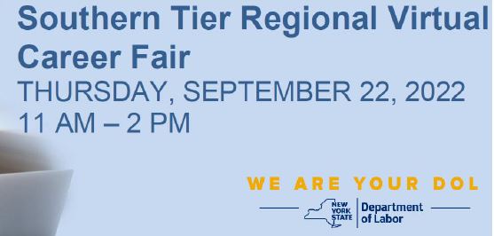 "The New York State Department of Labor is excited to invite you to our upcoming Southern Tier Region Virtual Career Fair, being held on Thursday, September 22nd from 11:00 am to 2:00 pm!"