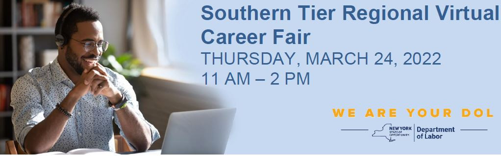 The NY Department of Labor's Southern Tier Regional Virtual Career Fair is tomorrow, Thursday, March 24th from 11 AM – 2 PM.