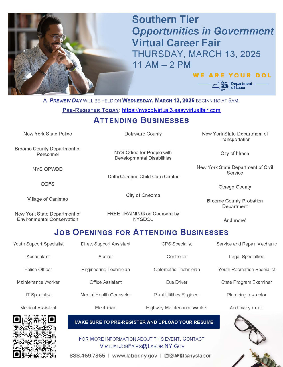There will be a preview day on Wednesday March 12th starting at 9am. Job seekers can register here: https://nysdolvirtual3.easyvirtualfair.com/.